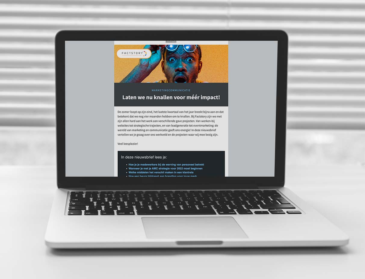 Een leuke tussenvorm van interne communicatie is de interne emailnieuwsbrief. Je kunt net wat meer kwijt dan met narrowcasting en het is laagdrempeliger dan een personeelsblad. Deze vorm passen we dus ook bij steeds meer klanten toe. Door de snelheid waarmee een emailnieuwsbrief kan worden verstuurd is het ultiem om urgentere kennis te delen, te informeren en daarmee meer verbinding en gemotiveerde mensen te krijgen.